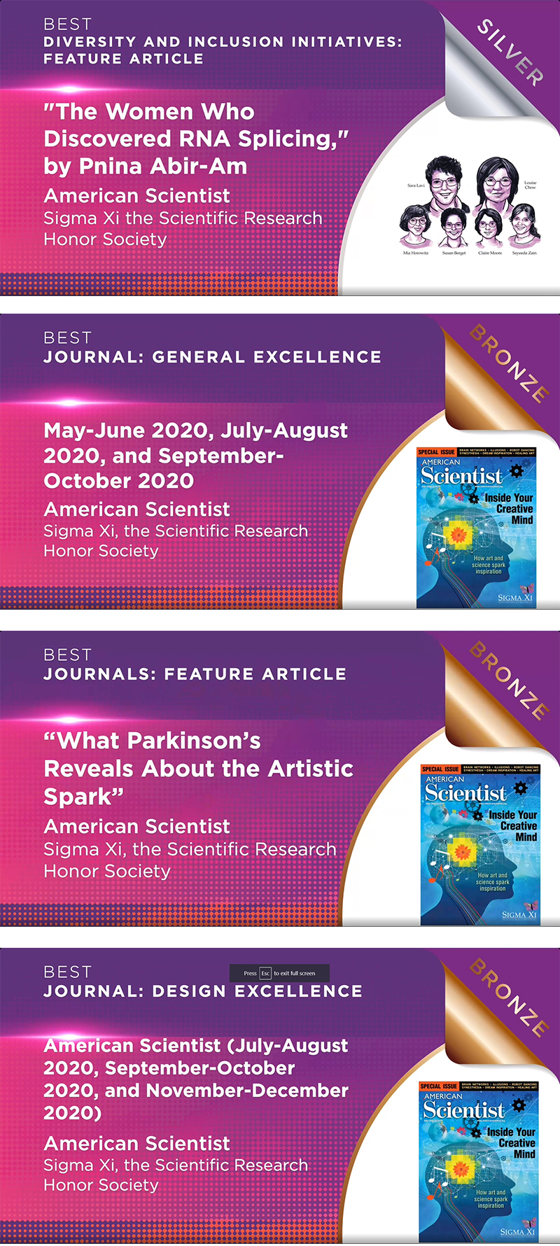 Below are the 2021 EXCEL Awards received by American Scientist: